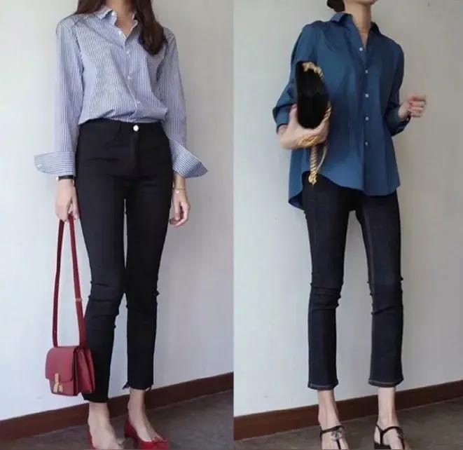 条纹衬衫搭配黑色紧身牛仔裤,颇具复古韵味。条纹衬衫可选择竖条纹,更显瘦。袖口微微卷起,露出纤细手腕。搭配红色单鞋和红色手提包增加亮点,整体造型精致时尚。