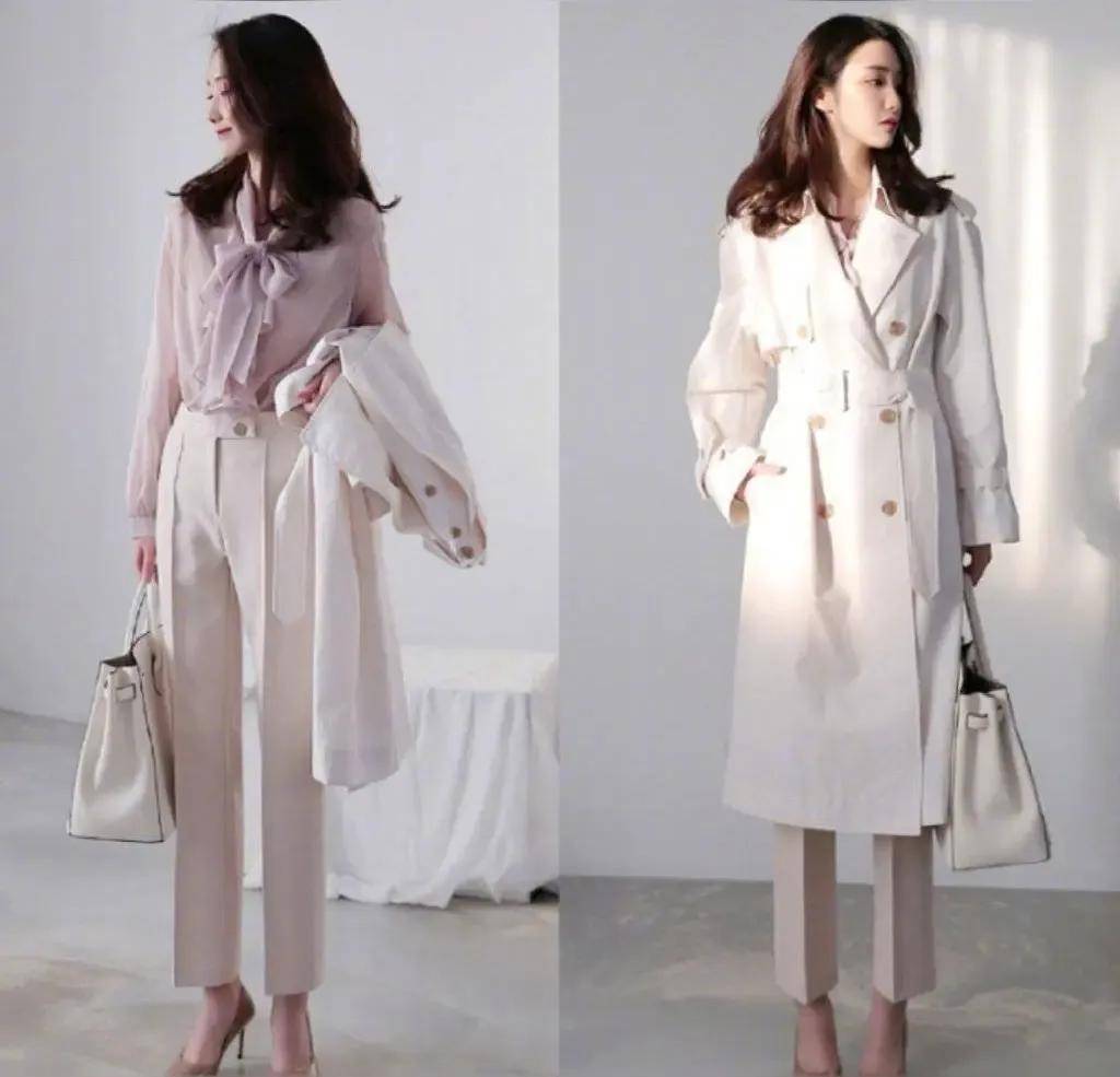 浅色系风衣永不过时。米白色风衣,经典双排扣设计,长度至膝盖左右,尽显气质。内搭一件同色系浅粉色蝴蝶结衬衫,温柔甜美。下身搭配米色直筒裤,脚穿裸色高跟鞋,再拎一个同色系手提包,整个人看起来优雅高级,适合在稍凉天气穿着。